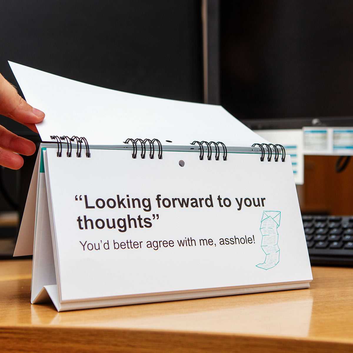 Do you find yourself signing off your professional emails with a 'kind regards' or 'all the best' when in reality you want to tell them to bug off and don't bother you again? With this hilarious novelty flip book, you can add some excitement and office humour to your working day as you translate your 'polite' emails into what you really mean! With a handy pull out stand included, you can take pride in letting your colleagues know how to take your emails, by turning this book into a sign and placing this fun office themed gift on your desk! With 50 pages of cheeky, funny and sarcastic translations, this flip-book makes the perfect gift for a colleague or friend on their Birthday, Promotion, or as a Secret Santa at Christmas!