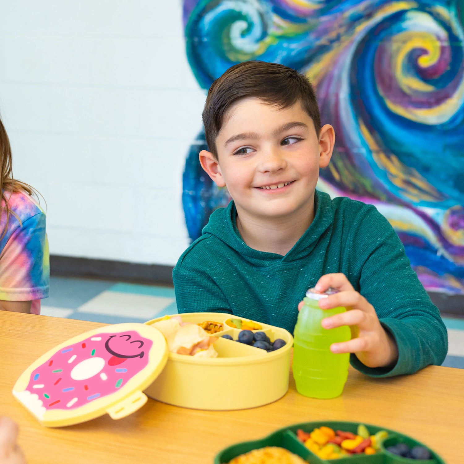 Good Banana Donut Bento Box designed with characters kids love and packed with features parents need, these protective food organizers add a big, healthy smile to snacks and meals. Food-friendly, BPA-free construction. Hard-walled to prevent food from getting crushed. Snack latch lid is secure yet easy for little hands to use. Largest compartments hold sandwiches, fruits, rollups, more.
