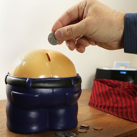 Make your investment in funny money. Just plop a coin into the slot to hear a hilarious (and pretty loud) fart. A huge variety of farting sound effects make every penny pinched a hoot.