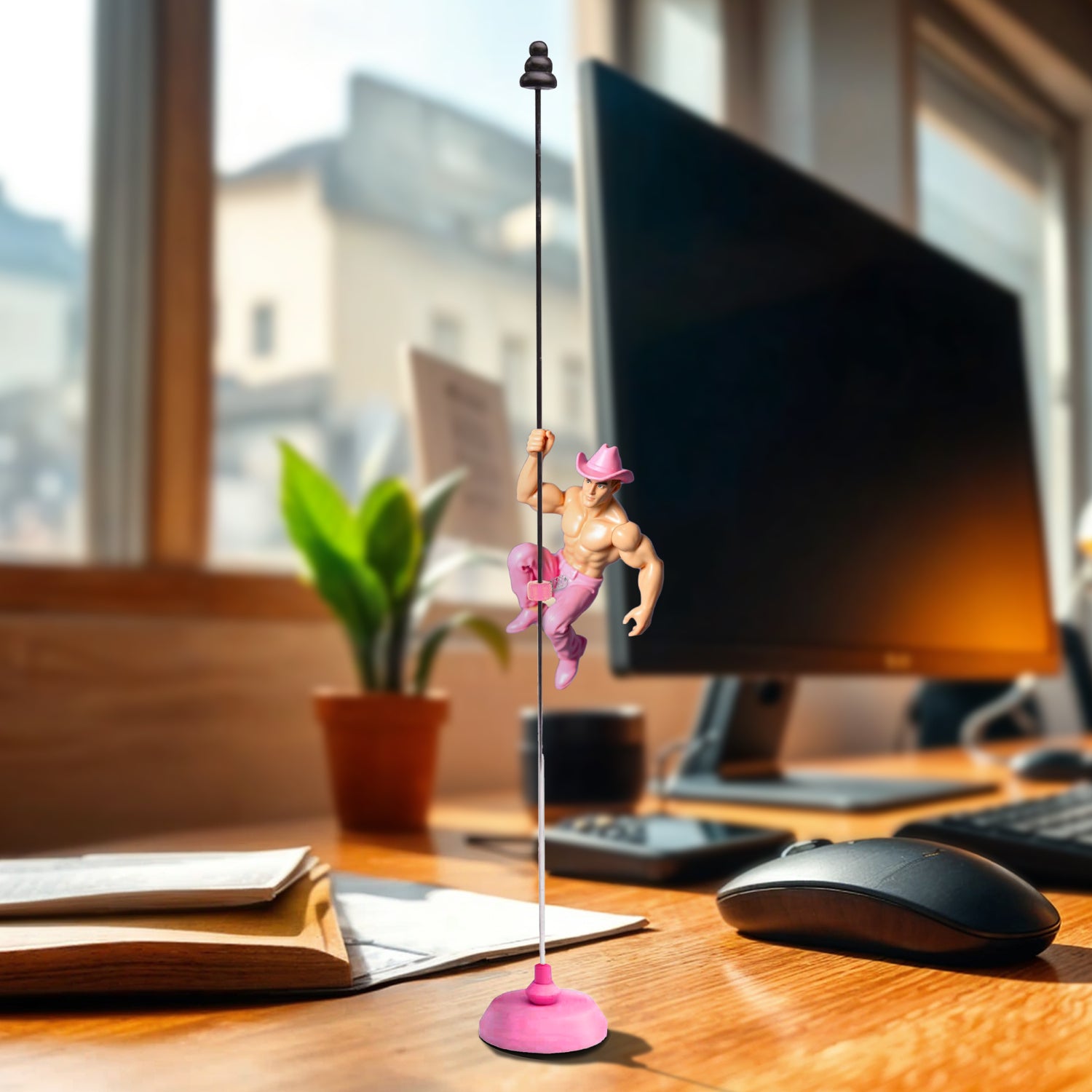 This playful desktop toy brings a twist on the classic woodpecker toy. We've swapped the traditional bird for three charming, shirtless hunks; a fireman, a cowboy, and a butler. Perfect for adding a bit of spice and humour to your workspace, they are ready to give you a little office eye candy as they swirl down their poles