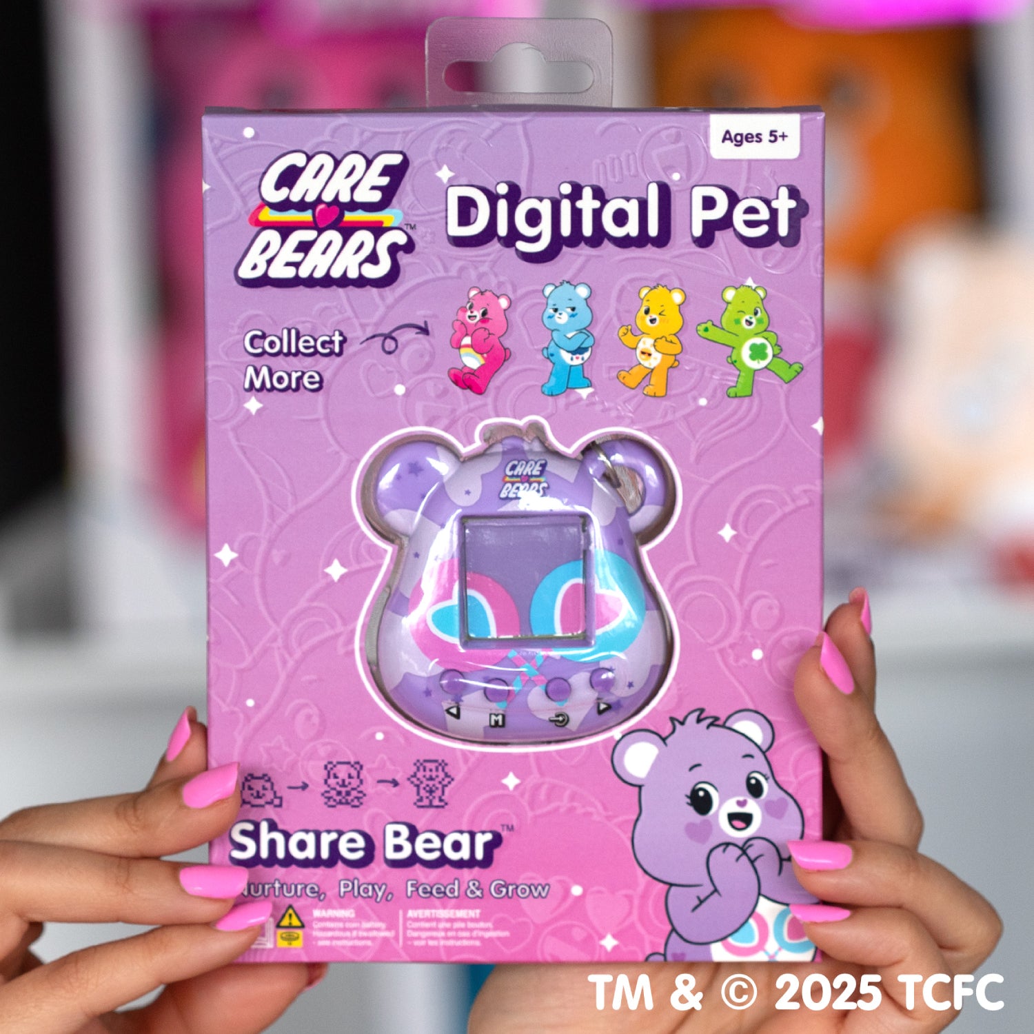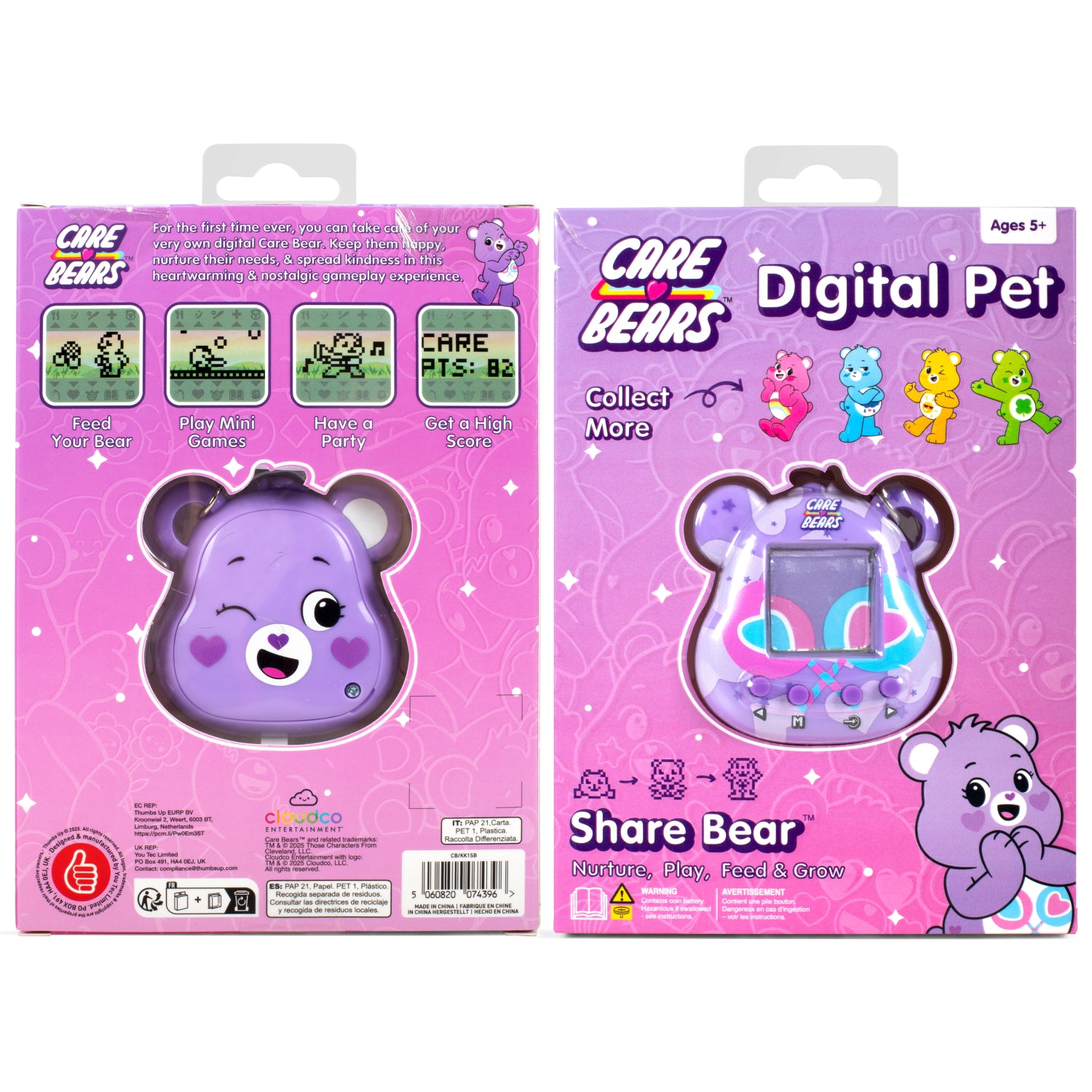 Meet Share Bear, the sweet, purple Care Bear brought to life in an interactive, handheld virtual pet. Featuring her signature heart-shaped lollipop belly badge, she encourages kindness through mini-games, caring tasks, and expressive pixel animations that teach empathy and connection.