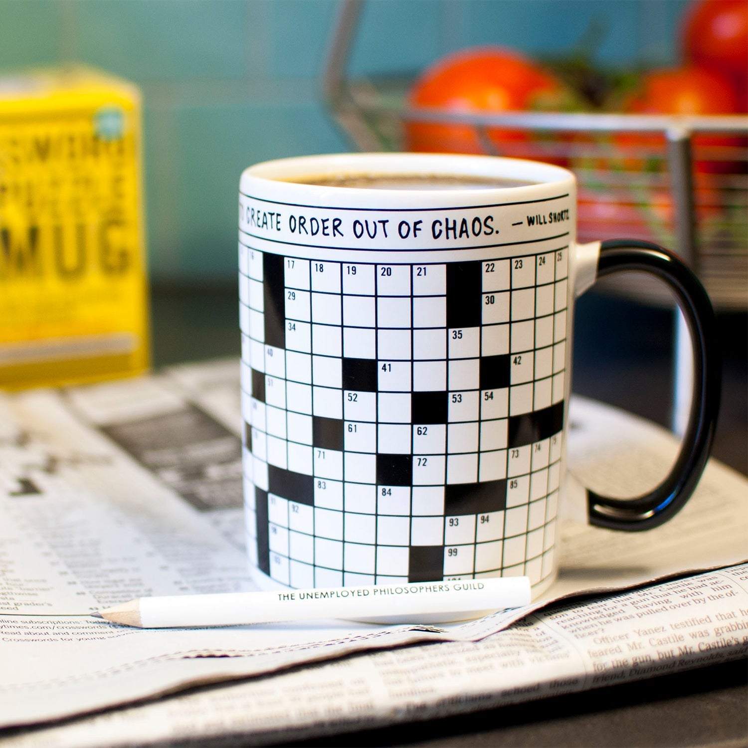 Don't just do your crossword OVER a cup of coffee, do it ON your cup of coffee! Each mug comes complete with a pencil and clues to your first puzzle right on the box. Holds 12 oz.