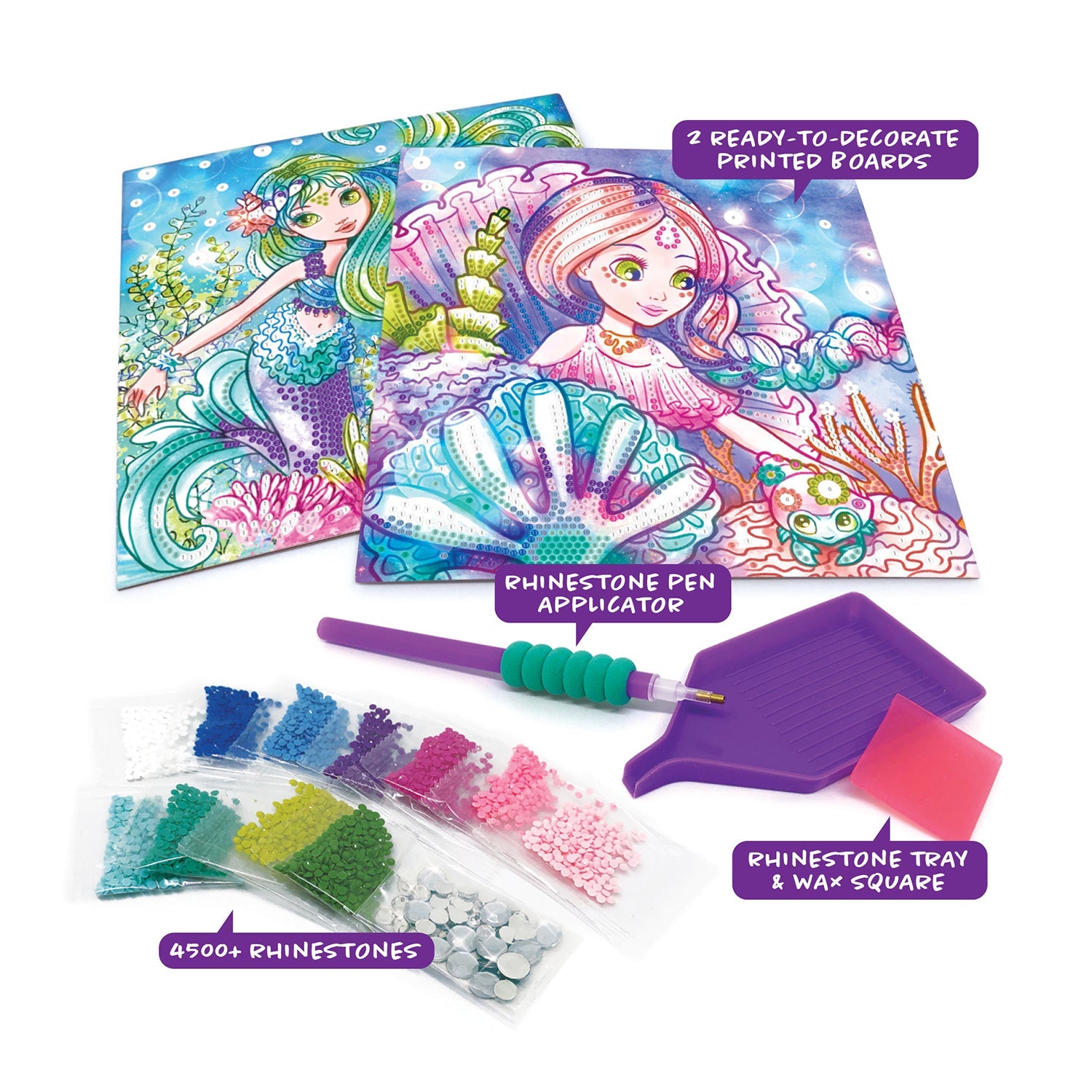 - Kit includes 2 ready-to-decorate printed boards, 4500+ rhinestones, rhinestone pen applicator, rhinestone tray and wax square