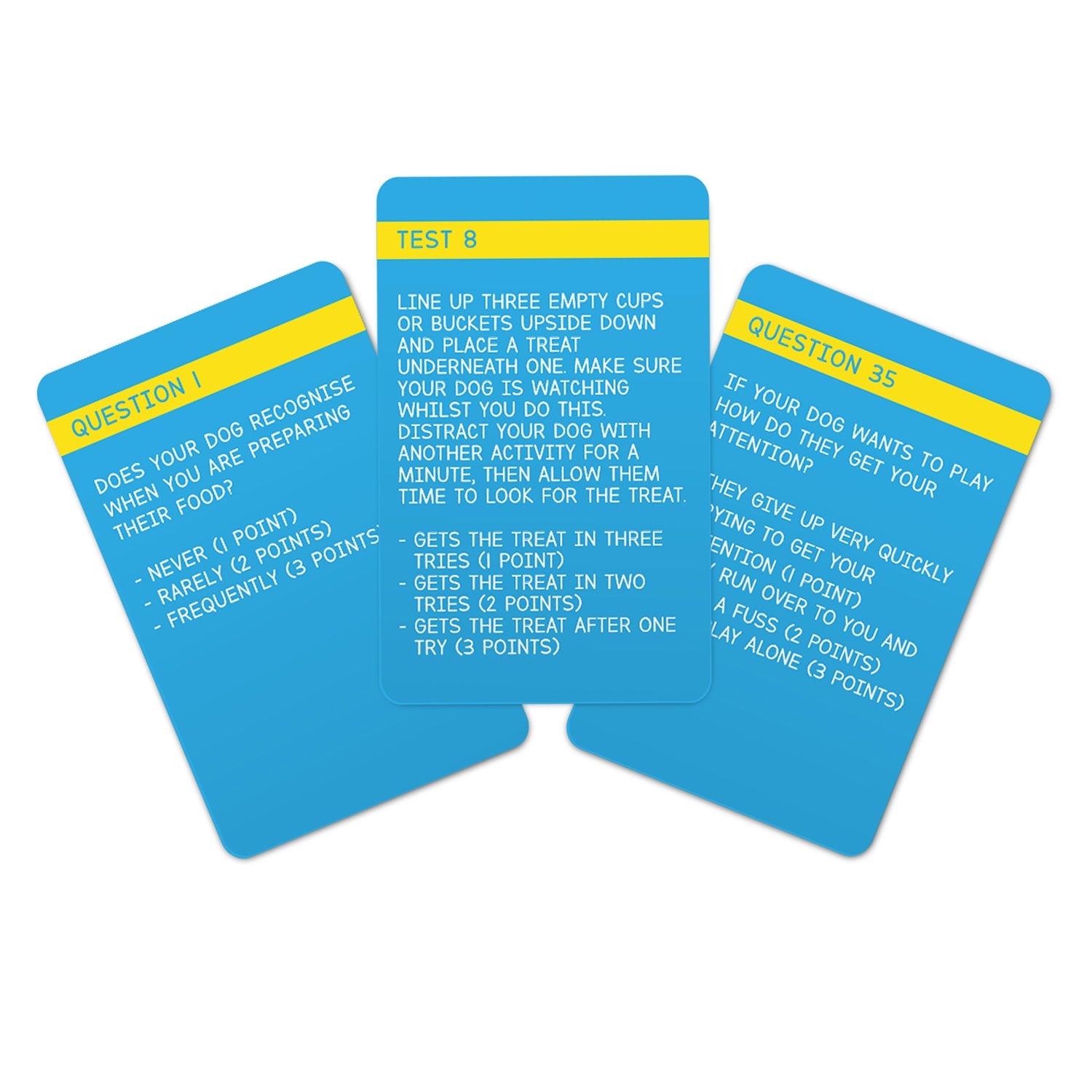 Is your dog the king of the park? Or is it too big for its bark! Now you can find out just how smart your dog really is by giving them the Dog IQ Test. This deck is designed to measure your dog's communication skills, social behaviour, motor skills and memory!