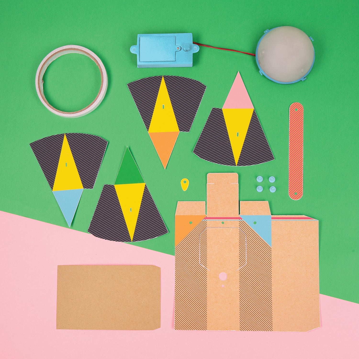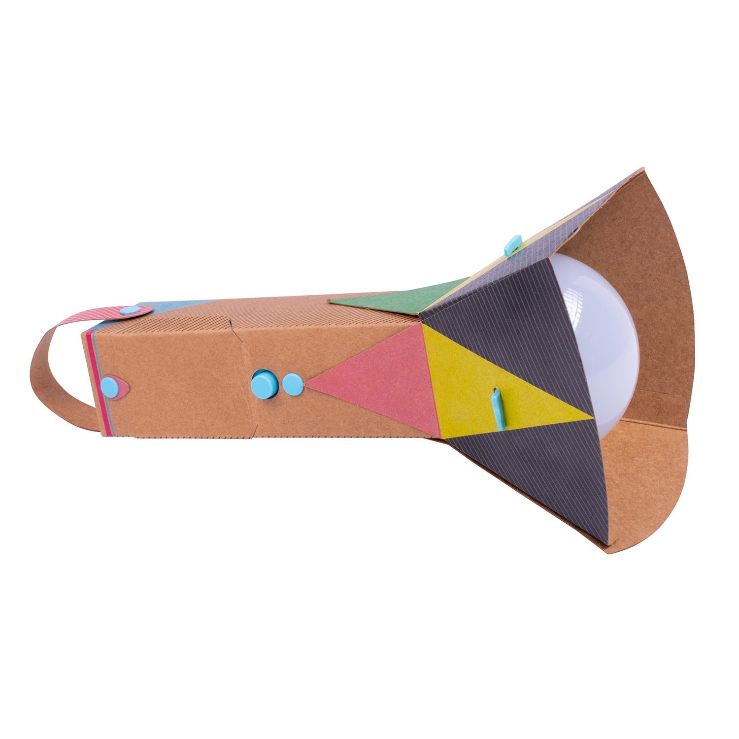 Create your own bright LED torch. Simply fold and stick the cleverly designed nets together and pin in the electrical components.