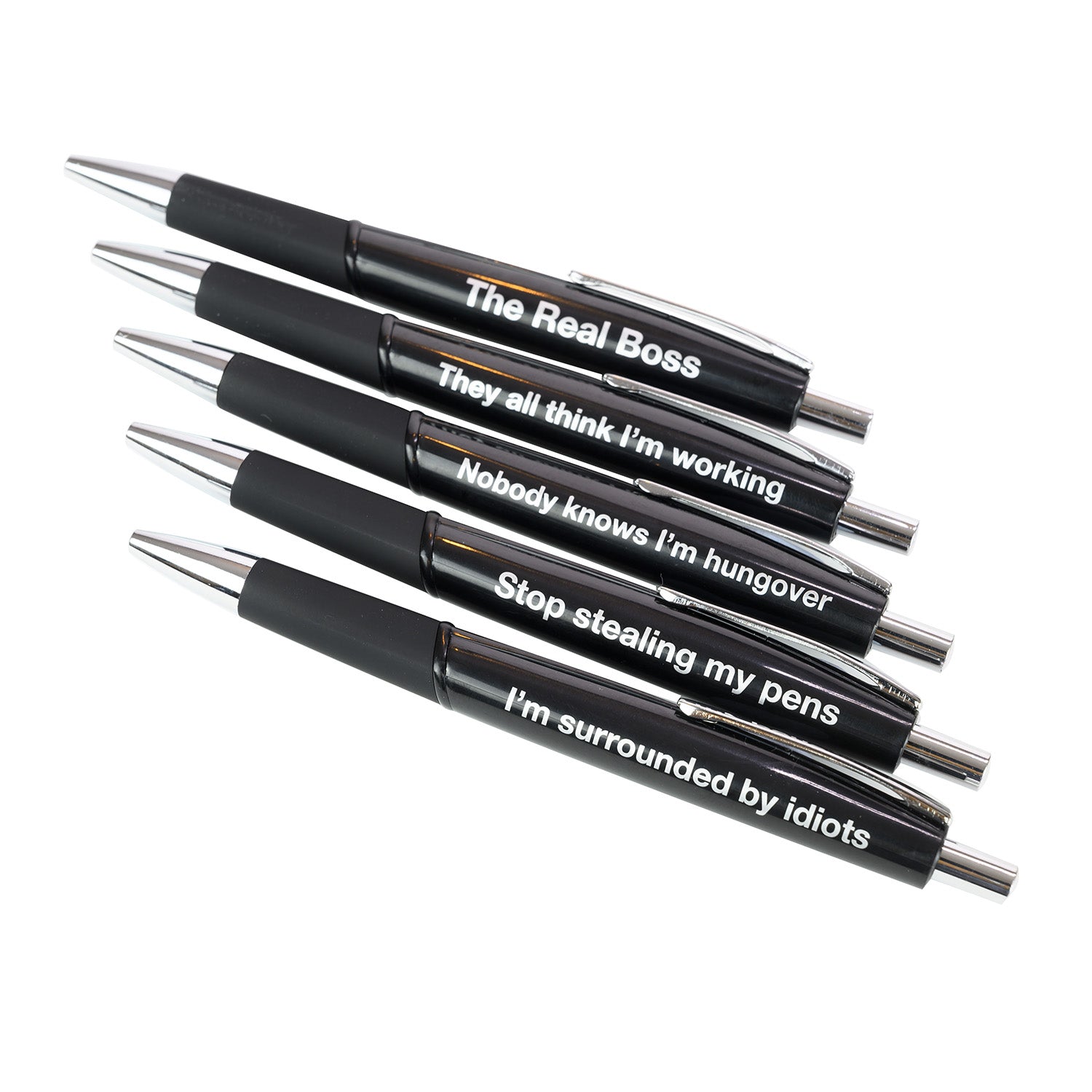 - The pens have with the following messages: Nobody knows I'm hungover, I'm surrounded by idiots, The real boss, Stop stealing my pens, They all think I'm working.