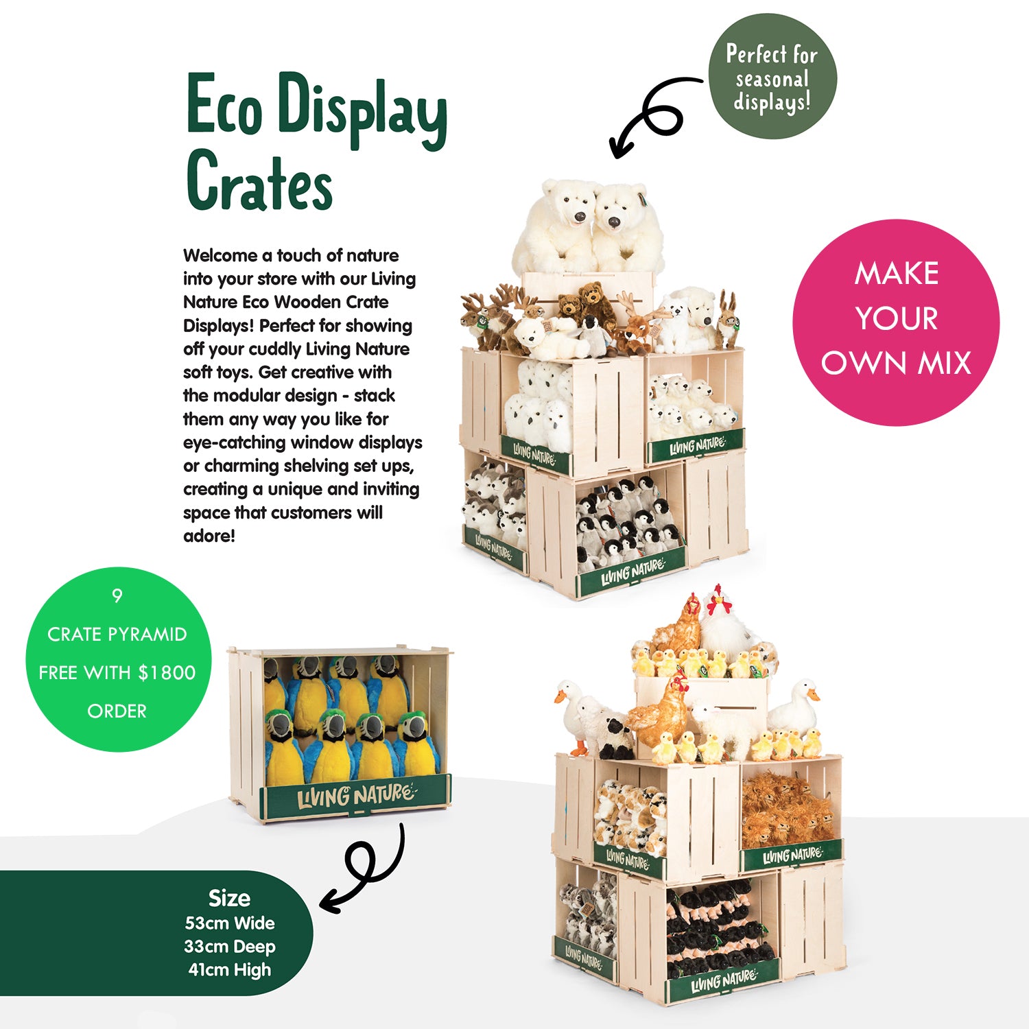 Welcome a touch of nature into your store with our Living Nature Eco Wooden Crate Displays! Perfect for showing off your cuddly Living Nature soft toys. Get creative with the modular design - stack them any way you like for eye-catching window displays or charming shelving set ups, creating a unique and inviting space that customers will adore!