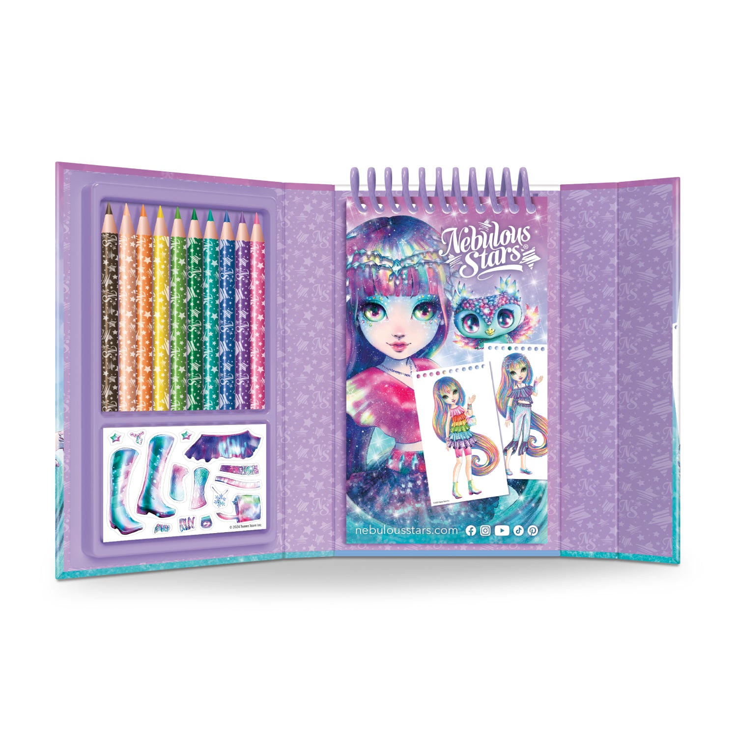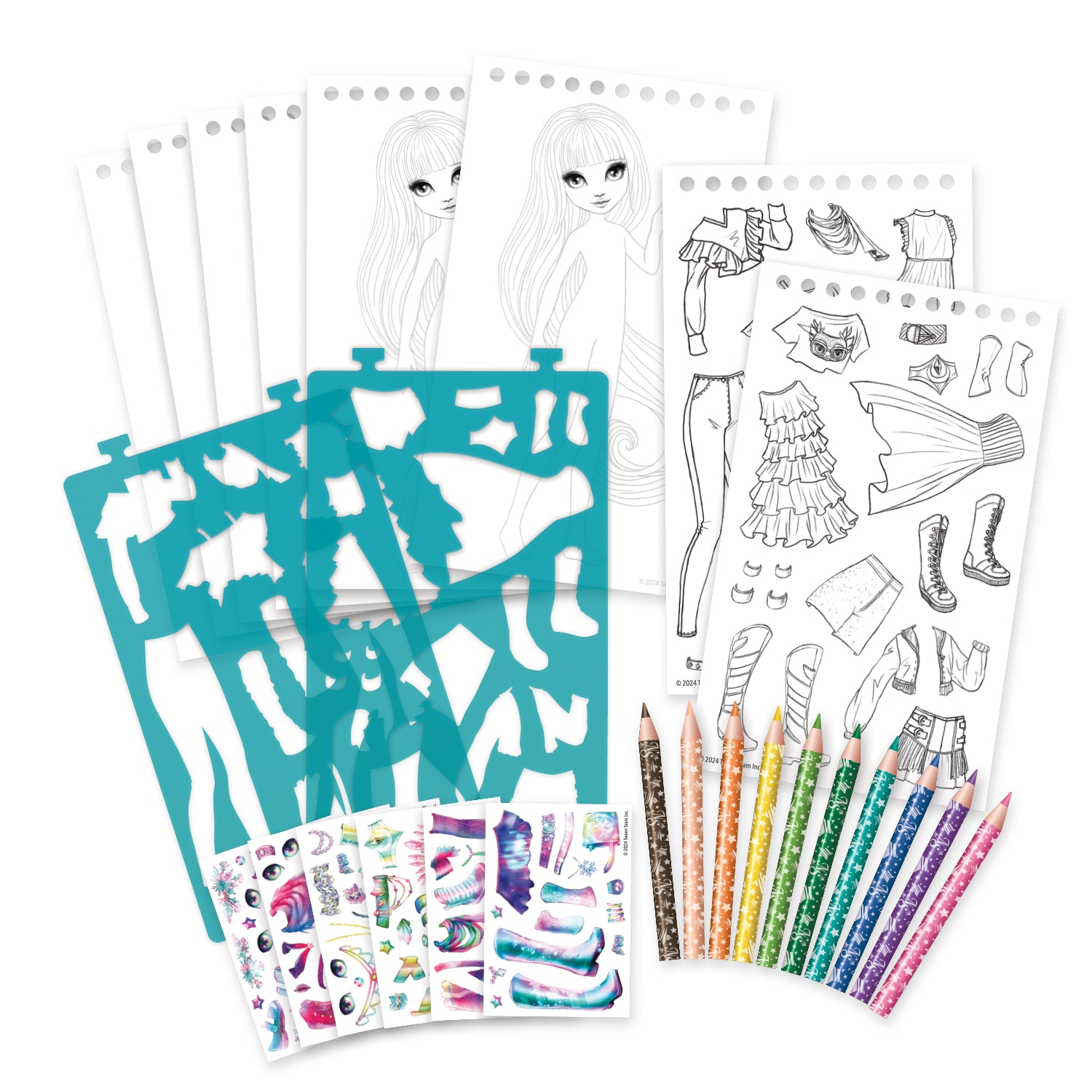 - Book includes 20 sketch pages, 2 stencil pages, 6 mini sticker pages, 10 coloring pencils and color instructions