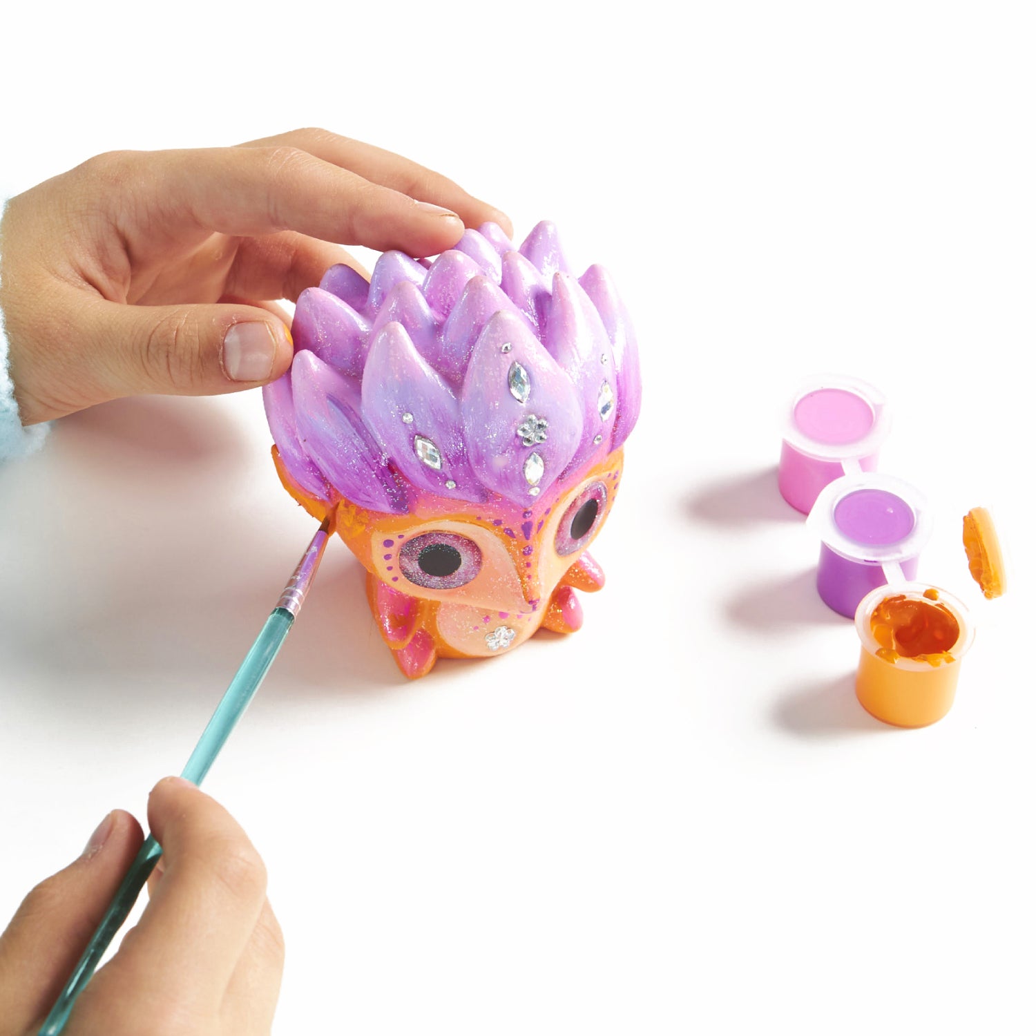 - Kit includes 1 ready-to-paint figurine, 5 colors of acrylic paint, glitter varnish, 2 paintbrushes, plastic stick, rhinestones and color instructions.