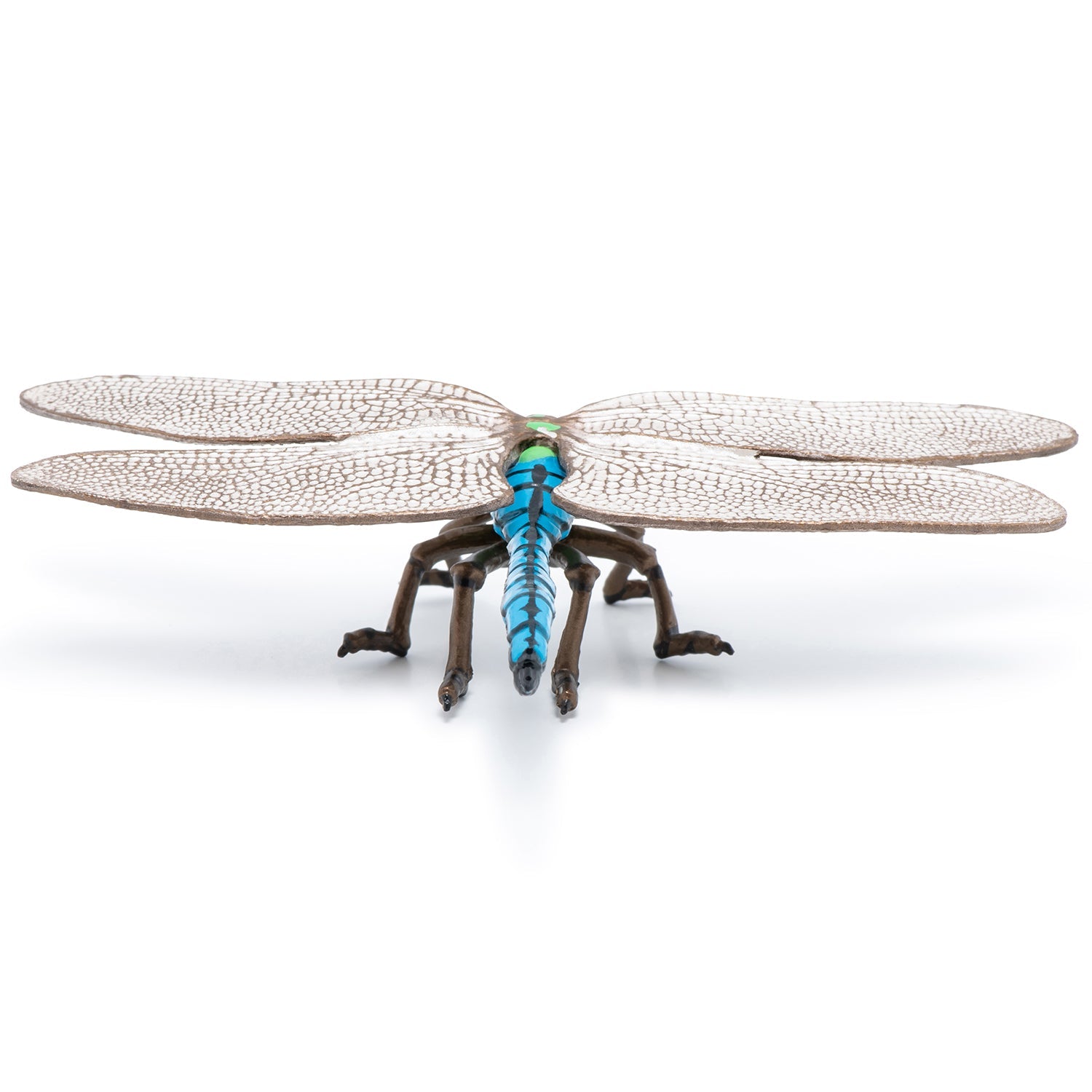 Papo’s Dragonfly is a beautiful model of the intriguing insect. It is sculpted in a standing position with all 6 legs on the ground and wings relaxed. Its legs and the outlines of its wings are painted metallic brown, while its thorax and head are green, and its abdomen and eyes are blue with black detailing. This pretty insect is the perfect addition to your collection, ready to flit and fly around and play.