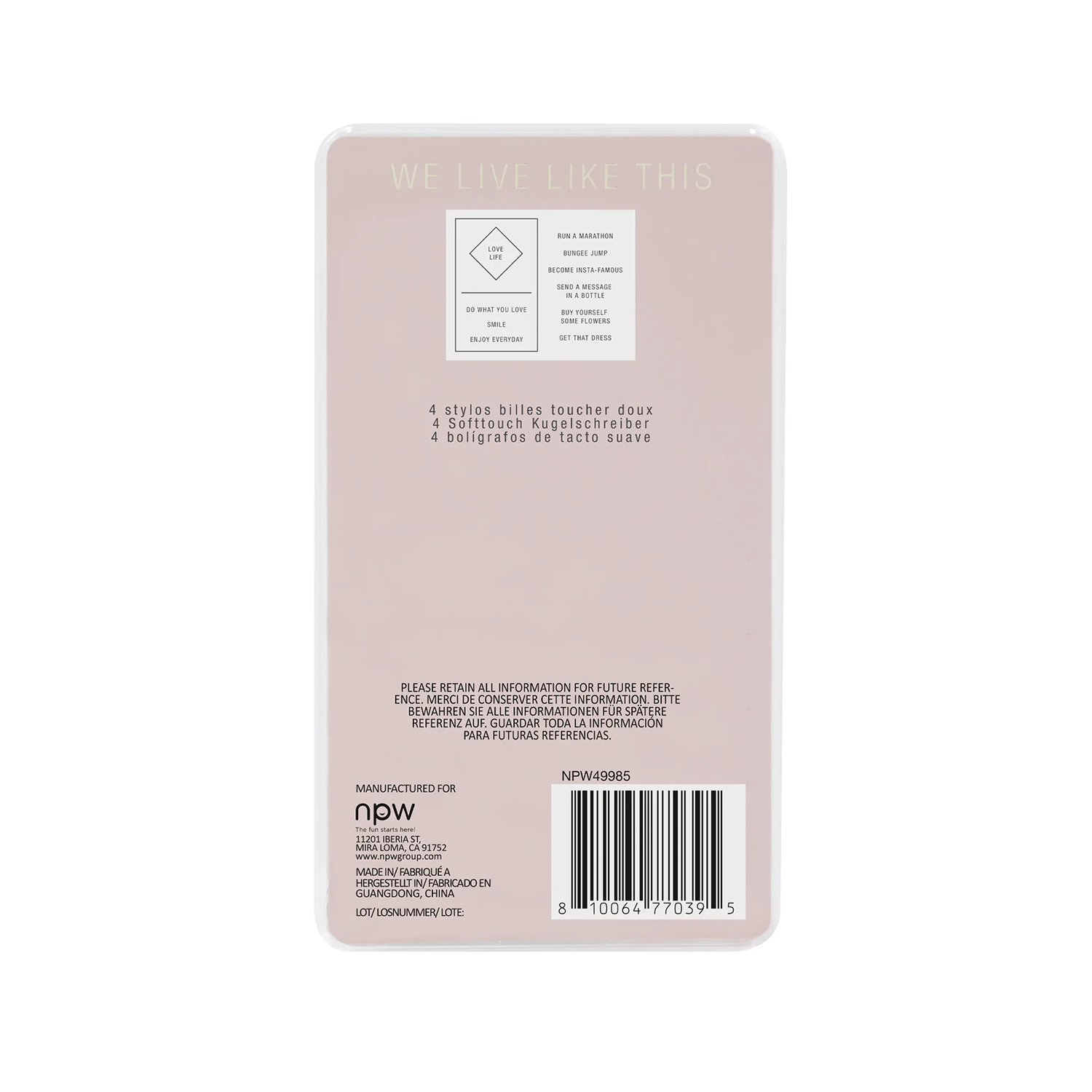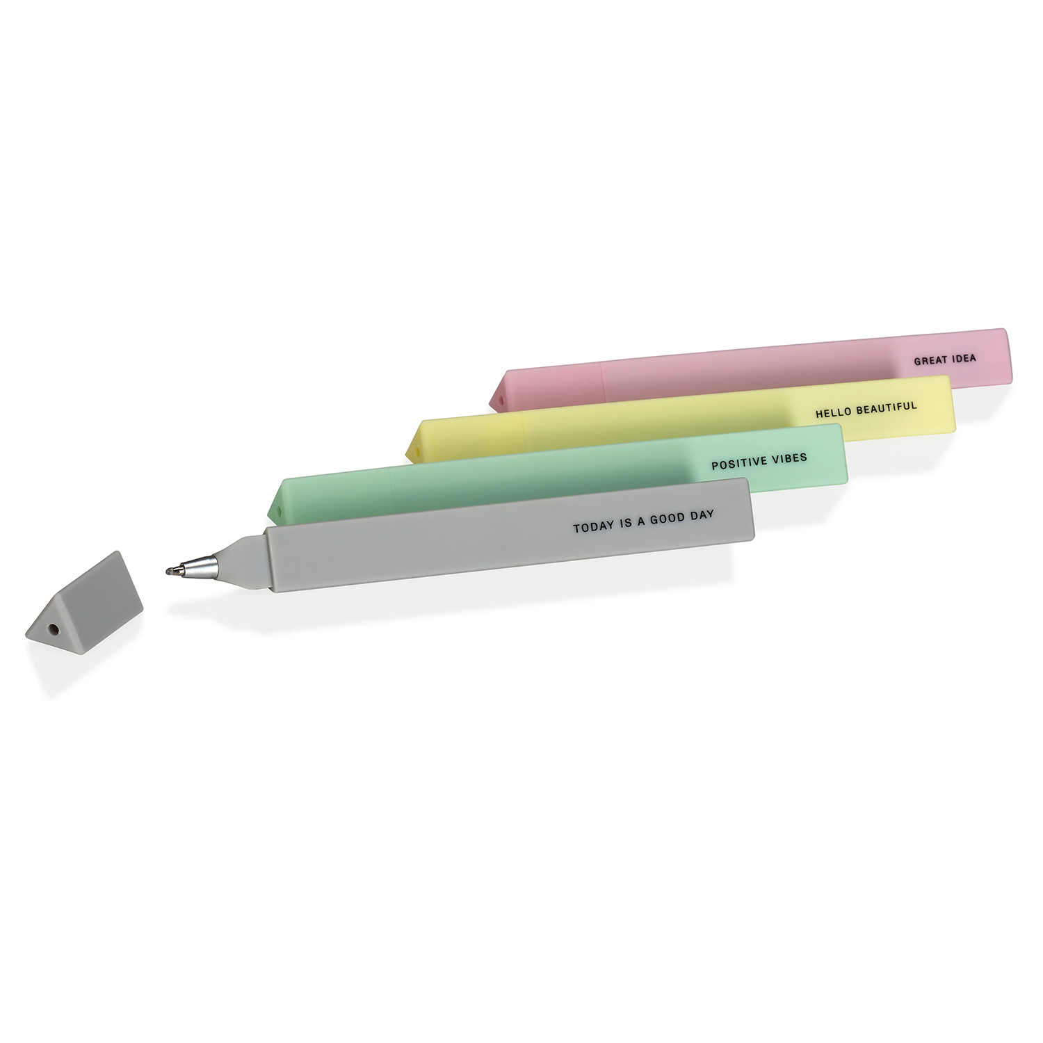 Take pleasure in the little things and make time to do what you love. The perfect companion to a journal, each Positive Pen is inscribed with a feel good mantra to channel positive vibes to your page. Pack of four ballpoint pens, double ended with triangular barrels.