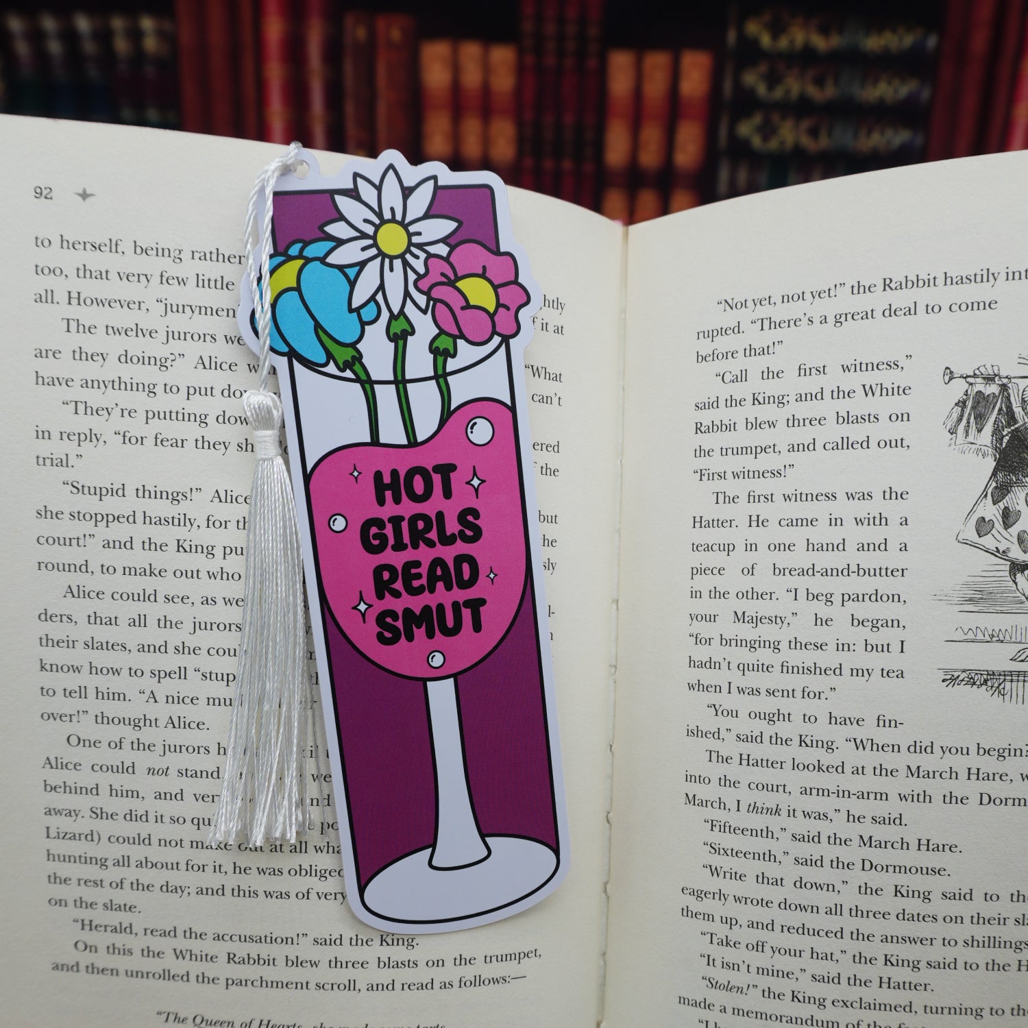 Each bright, bold design features a funny and relatable bookish saying and is topped with a metallic, silky tassel.