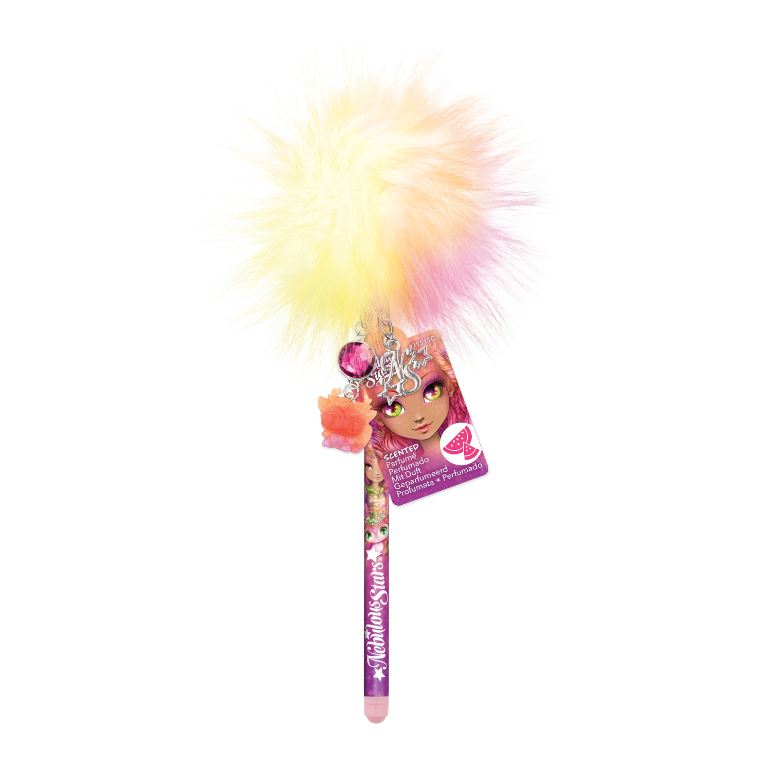 Ballpoint pen with rainbow pom pom, charms and scented ink.