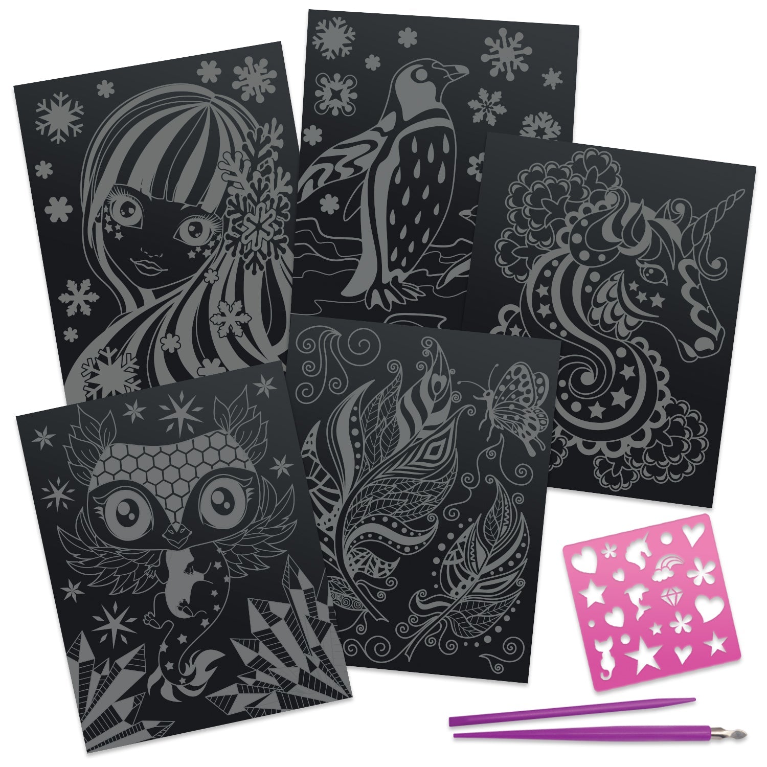 - Kit includes 5 scratch boards, 2 scratch tools and stencil sheet with 21 different shapes