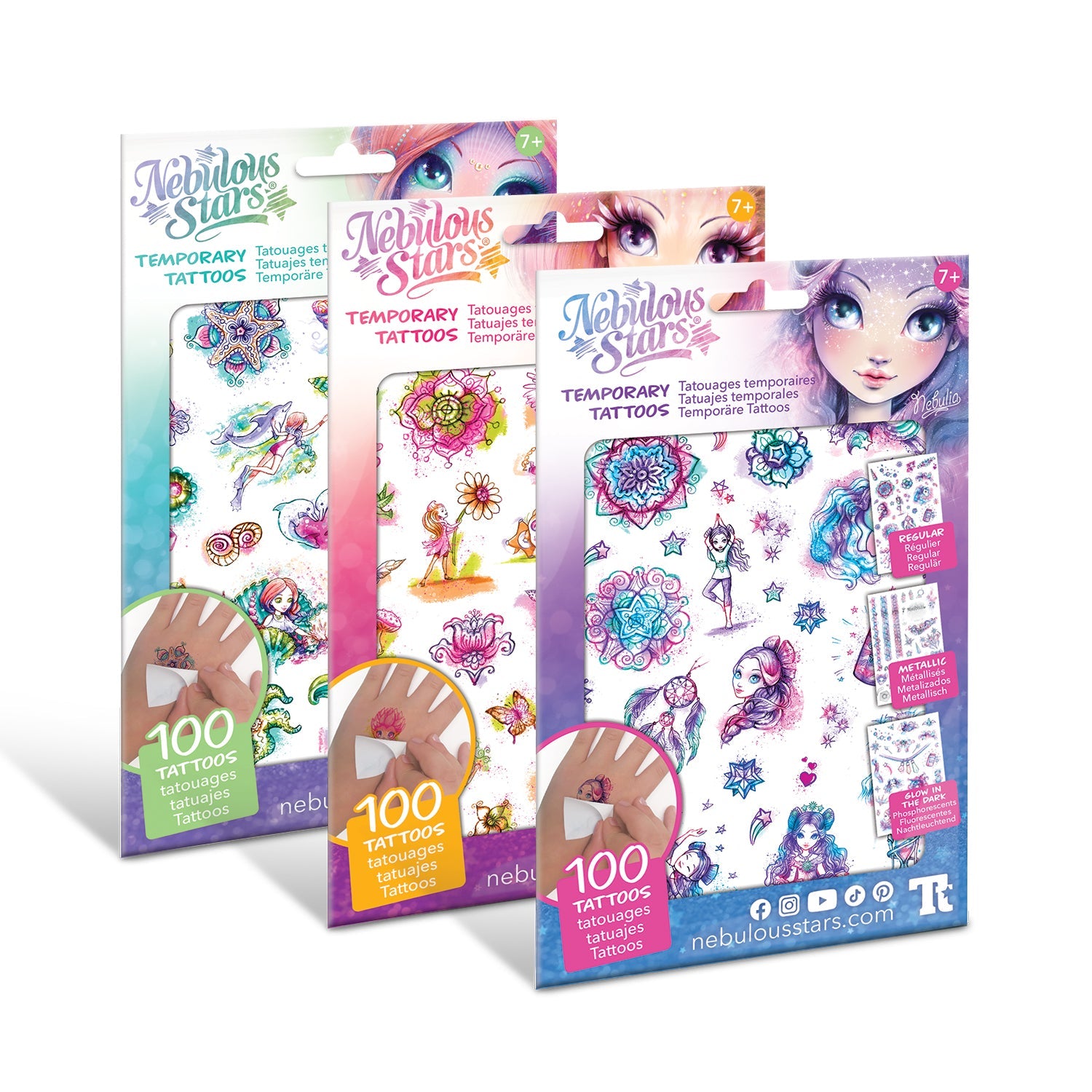 100 temporary tattoos made of original illustrations inspired by your favourite character. 3 times prettier with 3 fancy styles: Sparkling, metallic and glow in the dark.