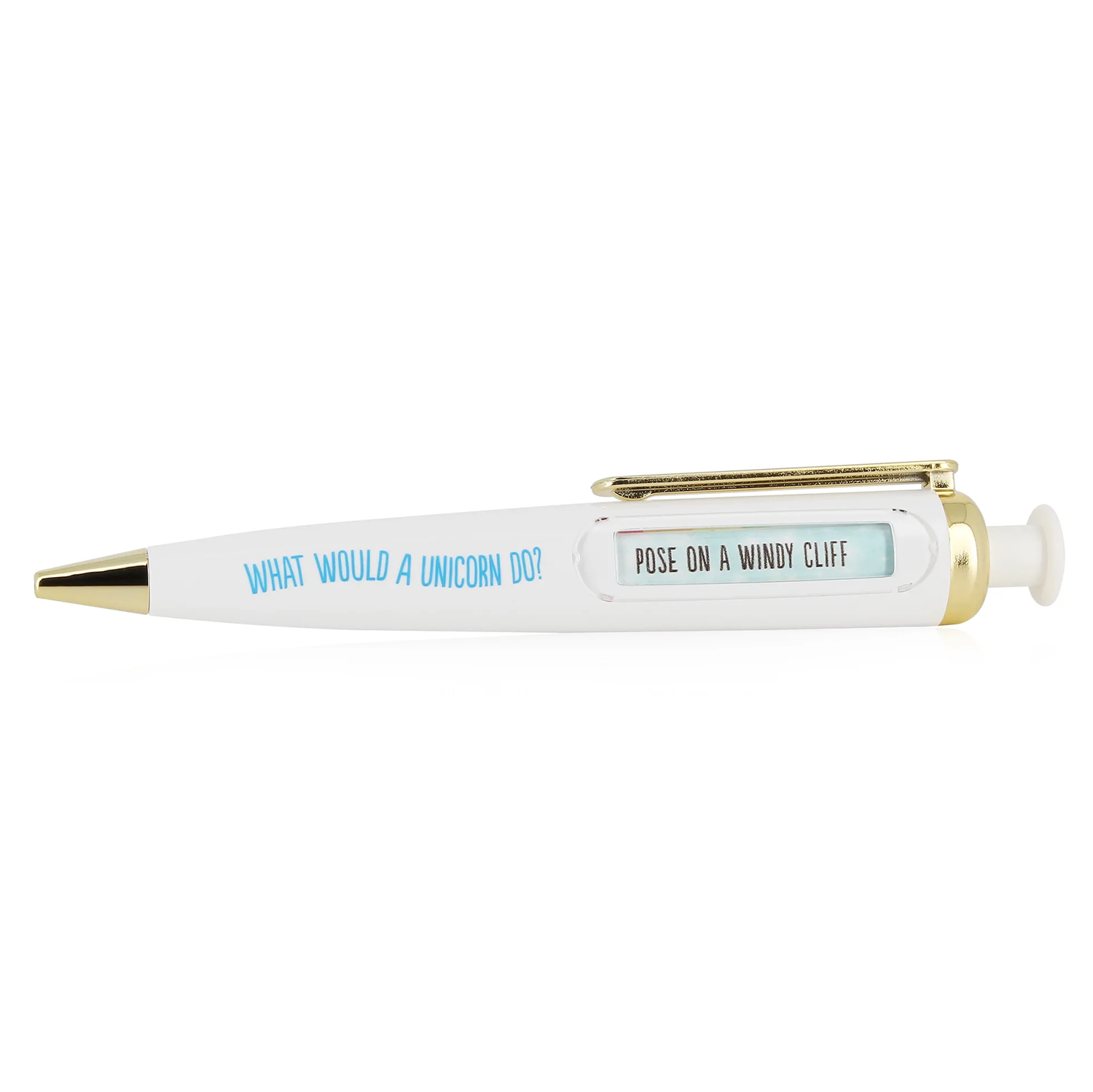 If you need to restore your faith in magic our What Would A Unicorn Do pen is here to help. Just click to discover what rainbow-fueled activity a unicorn would get up to and do the same. Quality black ballpoint pen in white plastic with rainbow window, gold colored nib and pocket clip.