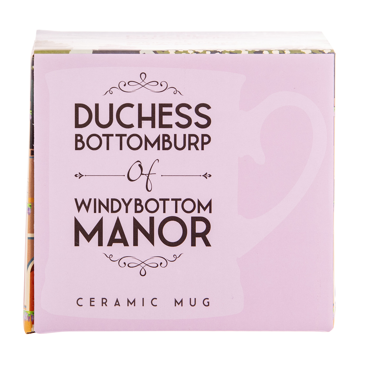 Everybody farts - even Dukes and Duchesses! This hilarious novelty 'Duchess Bottomburp' Victoriana Mug is complete with the fun text 'Duchess Bottomburp of Windybottom Manor', great for awarding someone their official *stinky* title! Printed onto a gorgeous lilac purple mug and presented in a quality graphic decorative gift box, this fun quote mug is the perfect gift for her on birthdays or at Christmas, and officially introduce her into the house of Trumpington (rightfully so)!